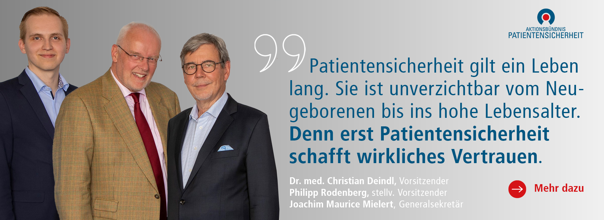 Das Aktionsbündnis Patientensicherheit e. V. ist ein unabhängiges Netzwerk von Akteuren aus dem gesamten Gesundheitswesen. Seit 2005 engagieren wir uns mit Projekten und praxisnahen Empfehlungen für mehr Sicherheit in der Versorgung. Fachkräfte finden bei uns fundierte Inhalte aus Projekten und Arbeitsgruppen. Patientinnen und Patienten erhalten verständliche Broschüren, Checklisten und Tipps für eine informierte und sichere Versorgung. Als Mittler von der Praxis für die Praxis sind wir zentrale Anlaufstelle für Politik, Wissenschaft und Öffentlichkeit.